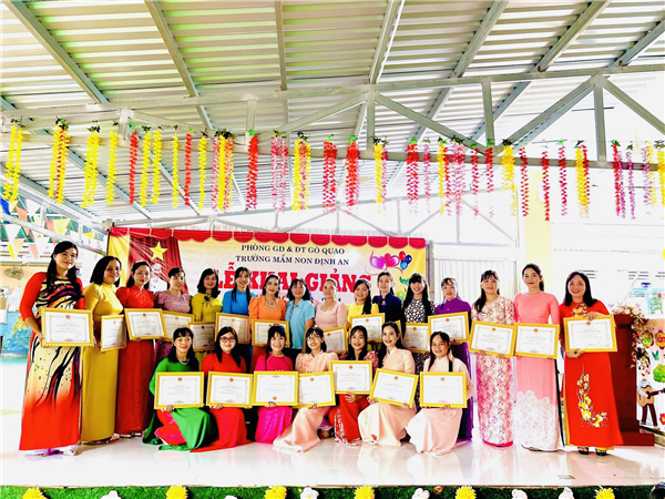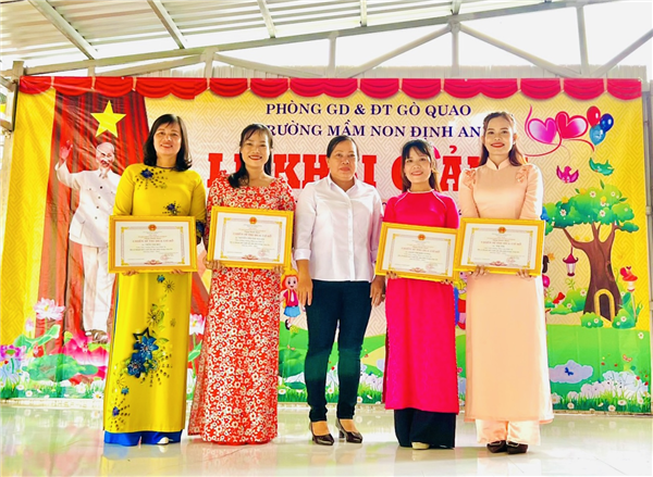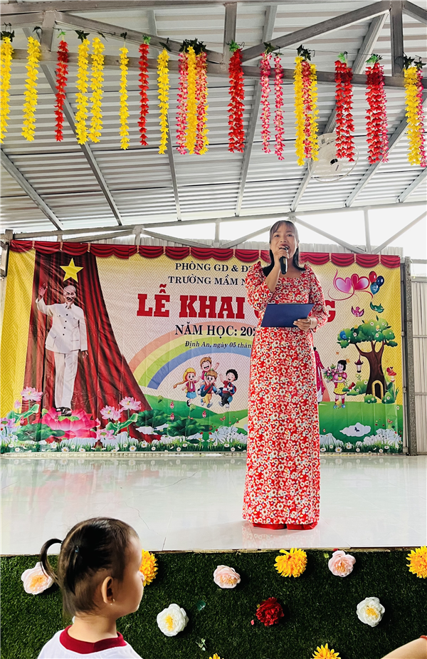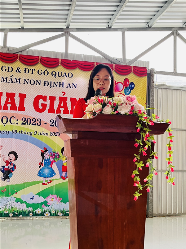 Trong buổi lễ, đại biểu, các thầy cô giáo và các cháu học sinh được nghe thư của Chủ tịch nước Võ Văn Thưởng gửi cho ngành giáo dục nhân dịp khai giảng năm học mới. Cô Nguyễn Thị Ánh Nguyệt, hiệu trưởng trường Mầm non Định An đọc diễn văn khai giảng năm học 2023-2024. Cũng trong buổi lễ đã trao 4 giấy chứng nhận Chiến sỹ thi đua cơ sở và 22 lao động tiên tiến của UBND huyện cho các cô có thành tích xuất sắc năm học 2022-2023.